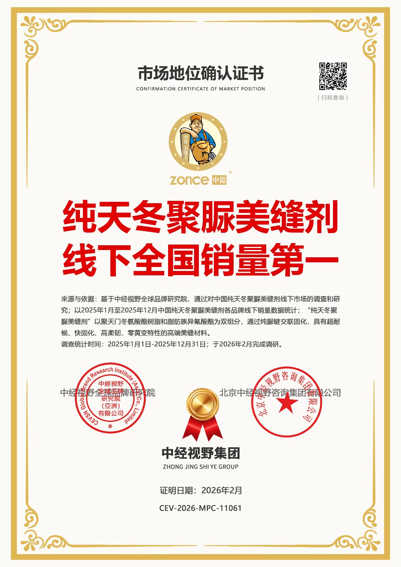​近日,中瓷美缝旗下纯天冬聚脲美缝剂正式获得权威机构认证,荣获2025年度“线下全国销量第一”市场地位。这一成绩不仅印证了其产品力已获消费者广泛认可,更标志着中国美缝行业正式进入以技术驱动、品质为先的新阶段。